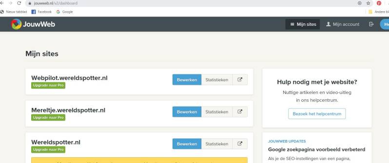 Op elke pagina van je site zal wel een reclame te zien zijn van jouwweb, wil je dat niet of wil je een eigen domeinnaam, dan kun je voor een betaalpakket kiezen, maar je kunt ook later altijd nog upgraden, wanneer het werken met jouwweb bevalt en je al een basis voor je website hebt gemaakt. (daarover later meer) Heb je meerdere jouwwebsites, dan kun je deze via je dashbord beheren.