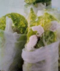 Zet de kippenbouillon op en leg de kipfilet erin, voeg de sesamolie e sojasaus toe en breng het aan de kook. Zet het vuur laag en laat de kipfilet 50 min garen in de bouillon. Laat dit samen afkoelen. Was de sla en halveer de blaadjes in de lengte. Leg een schone theedoek uit op je werkvlak, week daarna een voor een de rijstvellen in koud water. Wanneer ze zacht zijn uitleggen op de theedoek. Leg de sla blaadjes erop, snij de kip in repen en verdeel op de sla. Rol het rijst vel strak om de sla en kip, sla de punten dicht. Snij elke rol in tweeën.